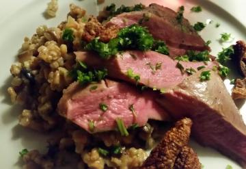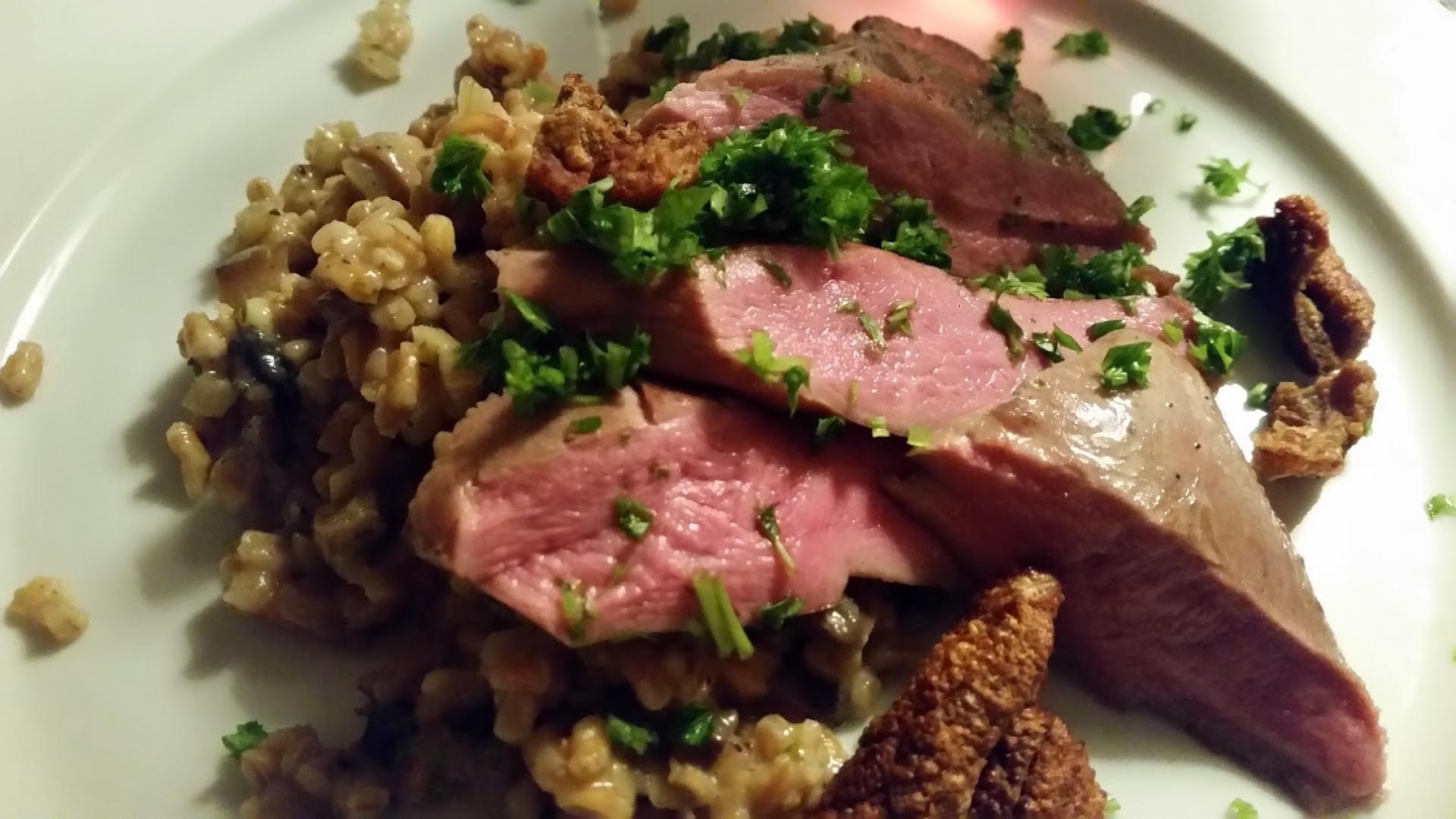 ...med perlespeltrisotto og "andeflæskesvær".